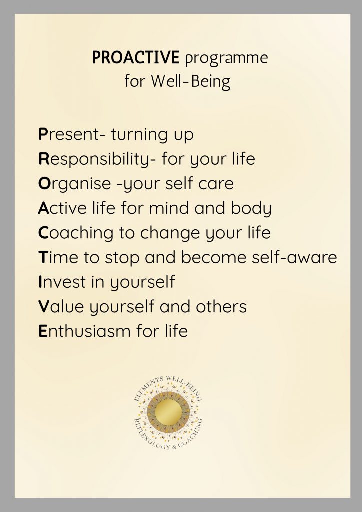 My coaching approach is based on taking a PROACTIVE view of well-being. I use these strands to help you gain new perspectives in your life. We work together to use your strengths to set targets and move forward. The tools that you develop in the coaching sessions will allow you to make changes to yourself long after the coaching has finished.